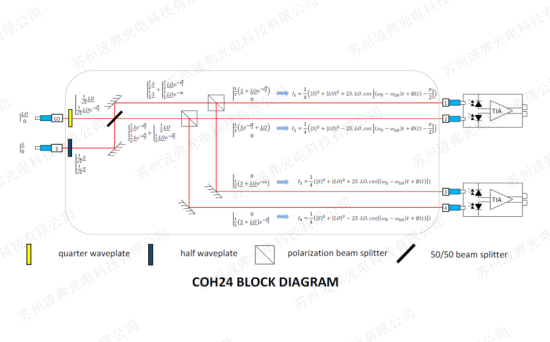 90°光混频器(超链接)在相干光通信系统中的主要作用是将两束频率接近、相位差恒定的且偏振方向相同的信号光与本振光波进行相干混频,再利用光电平衡探测器和信号处理对中频信号进行分析,可以看出其原理上也是一种调制解调器。常见的 90°光混频器为2(输入)x4(输出)端口结构,如上图,其由分立的四分之一波片、半波片和偏振分光镜等光学元器件构成,四个输出端分别相差为0°、180°、90°和270°。0°与180°输出端经过平衡探测器后的支路称为同相I支路,90°与270°输出端经过平衡探测器后的支路称为正交Q支路。