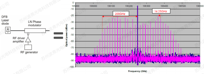 在保留载波的情况下,最简单也是最常用的操作就是通过相位调制器产生边带, 举例如下图,射频信号频率为14.25GHz, 根据驱动电压强度大小,可以产生10多阶边带,将载波光谱展宽至400GHz数量级, 入射的载波频率也被保留。
