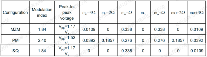 3. 强度调制器所产生的1阶边带强度高于相位调制器(见下表),因为相位调制器有部分强度分布在其他阶边带上