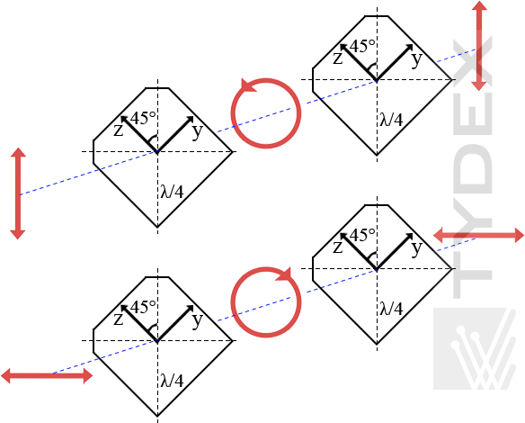 由双折射材料制成的平平板用于改变辐射的偏振态。 波片通过移动波的两个垂直偏振分量之间的相位来工作。 最常见的波片类型是半波片(λ/2 片)和四分之一波片(λ/4 片)。 λ/2 板给出相位延迟 π 和 λ/4 板 — π/2。 半波片改变线偏振光的偏振方向。 四分之一波片将线偏振光变为圆形,反之亦然。 如果偏振方向沿波片轴之一,波片不会改变线偏振光束的偏振。