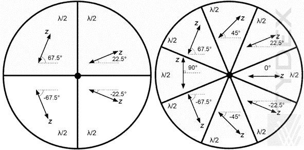 由几个特殊定向的半波片组成的分段波片允许从线性偏振的辐射获得径向和方位角偏振的辐射。 这种波片的工作原理如下所示。
