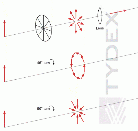通过将分段波片旋转 45 度,可以将径向偏振变为方位角偏振。 通过将波片旋转 90 度,径向偏振方向变为相反的方向。 分段波片与正透镜的组合使辐射沿其传播方向偏振。